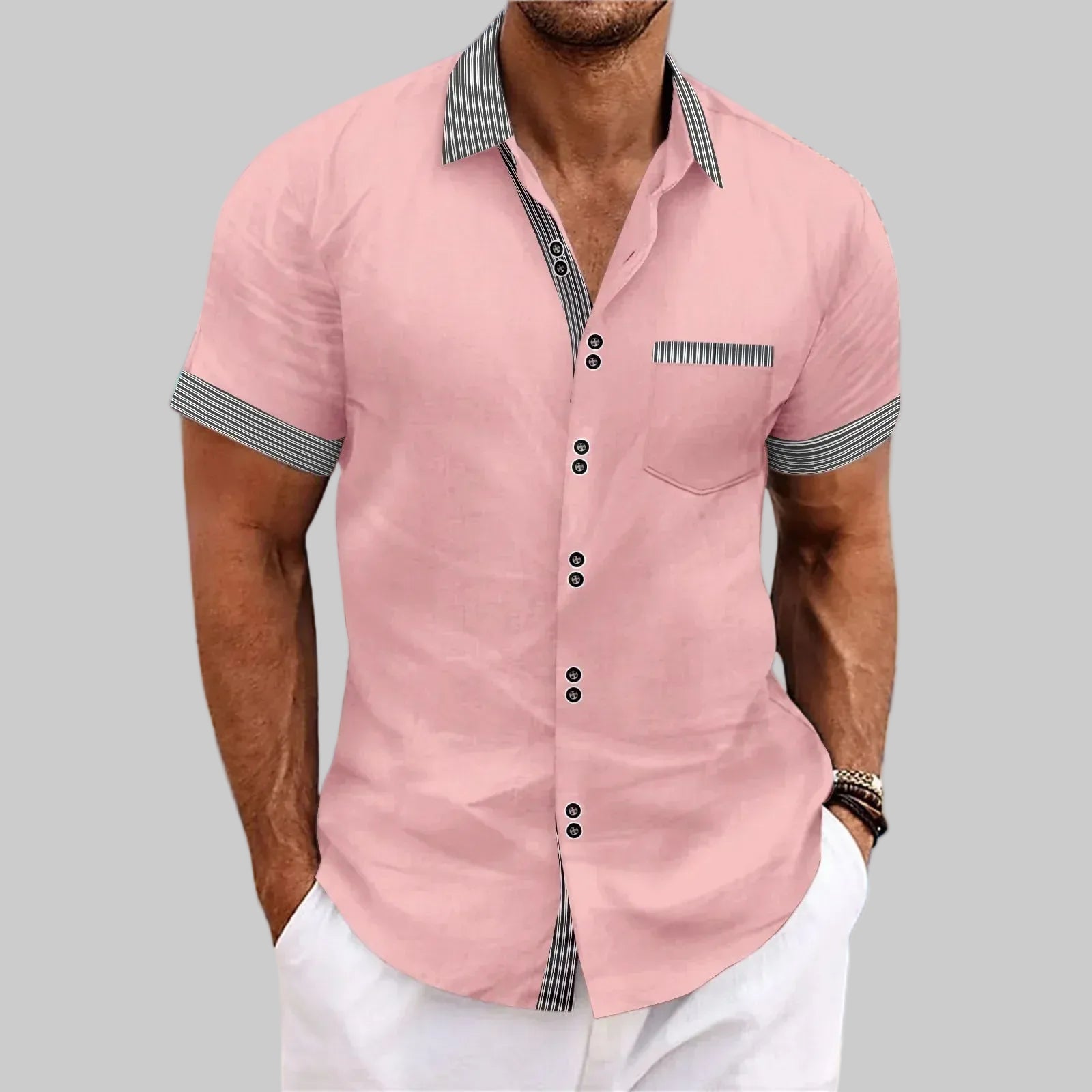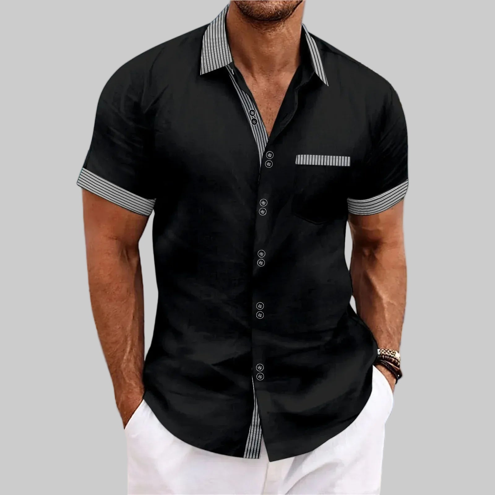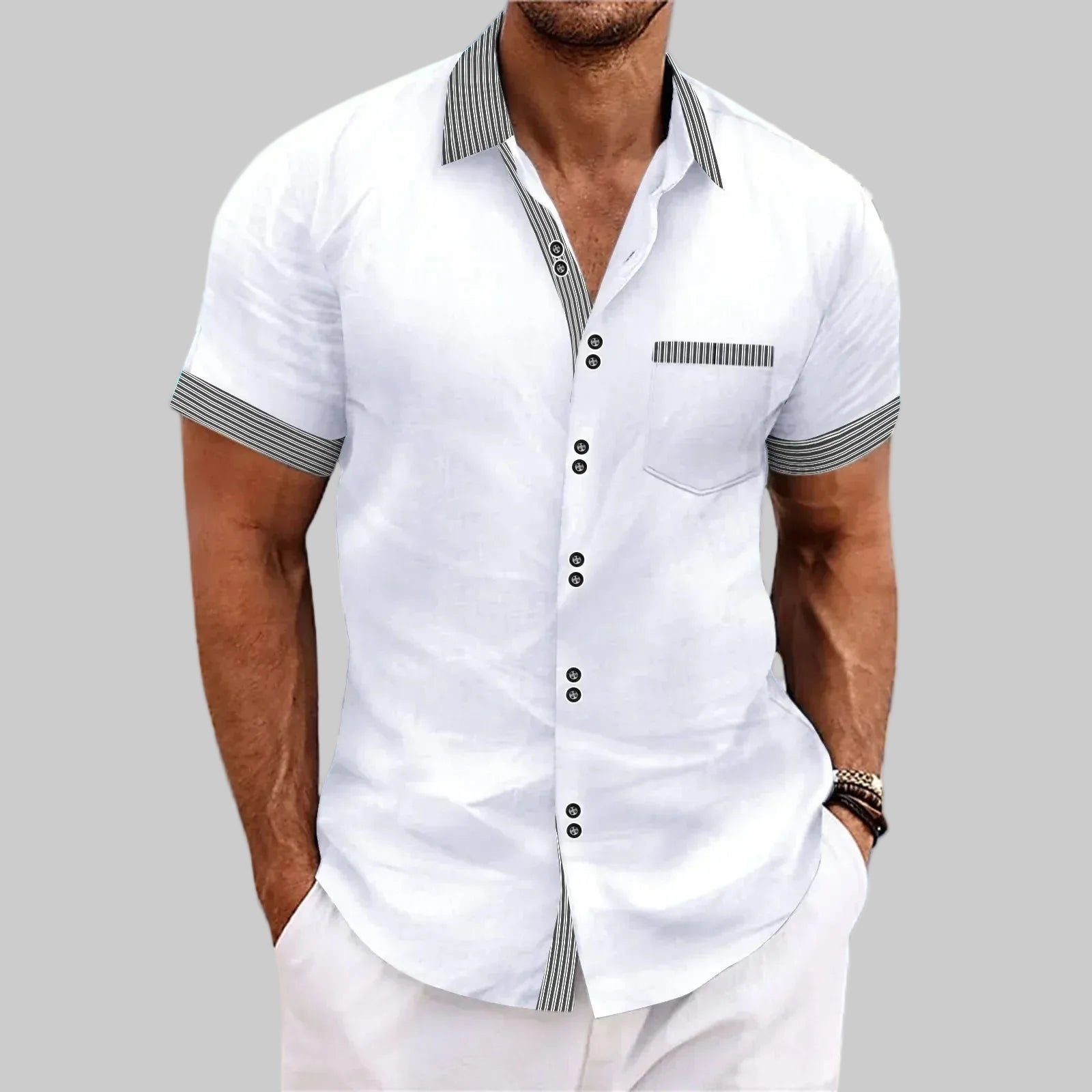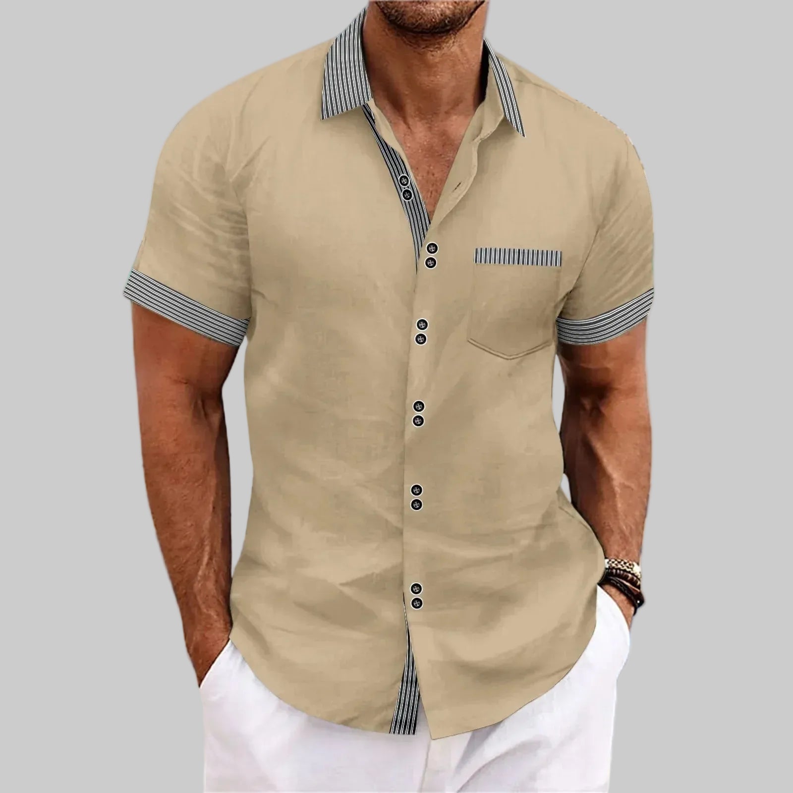 Denne herreskjorten kombinerer raffinert enkelhet med behagelig komfort. Designet for mannen som velger kvalitet og et velstelt, rolig uttrykk. Det lette og pustende materialet føles behagelig mot huden og er spesielt godt egnet for varmere dager, mens snittet gir en pen og balansert passform.