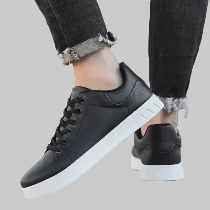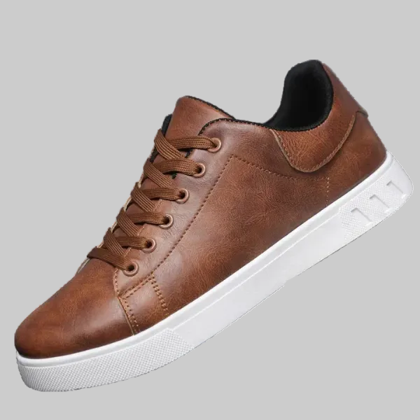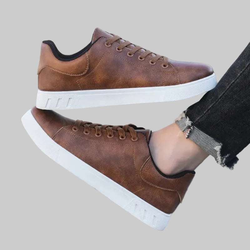 Denne sneakersen kombinerer et rent og minimalistisk design med en varm brun skinndetalj. Den glatte finishen og de subtile linjene gir et rolig og modent uttrykk som enkelt kan kombineres med både jeans og chinos.