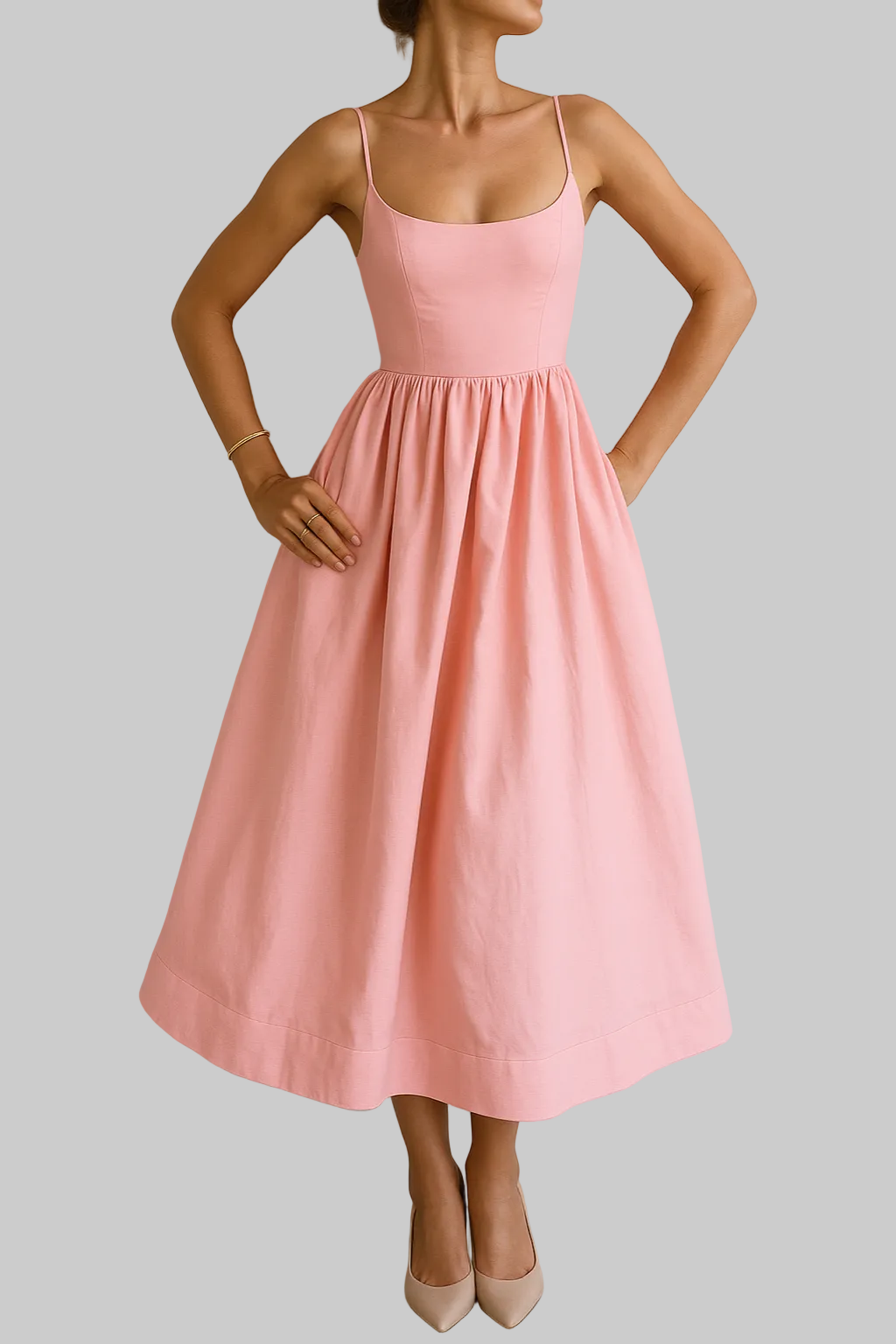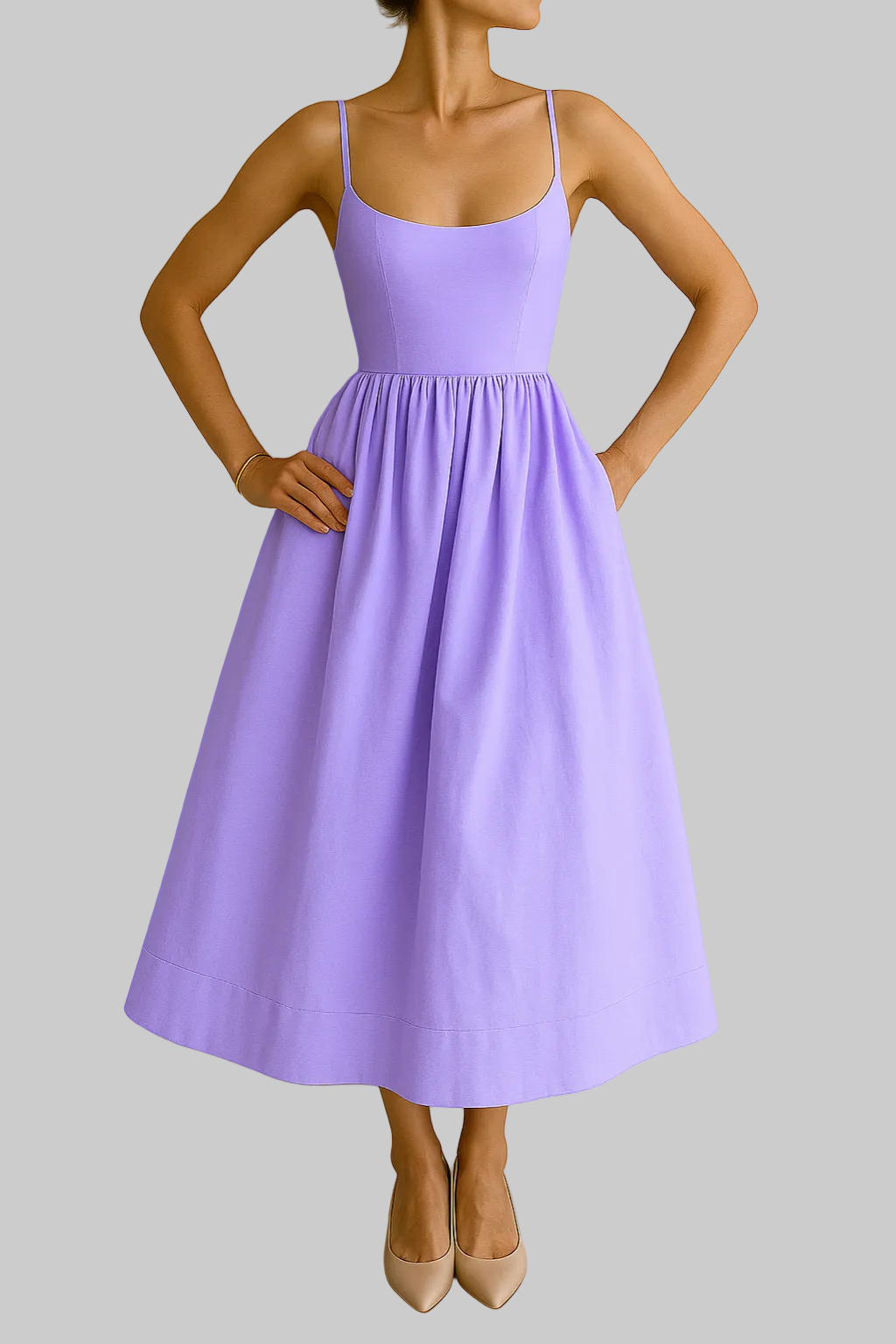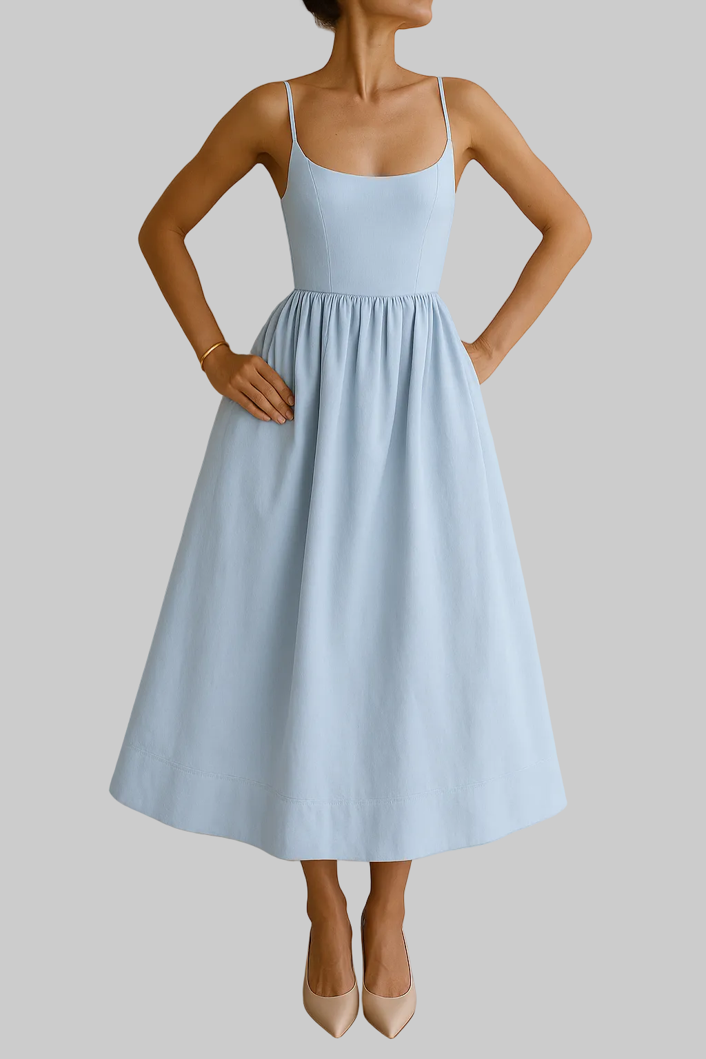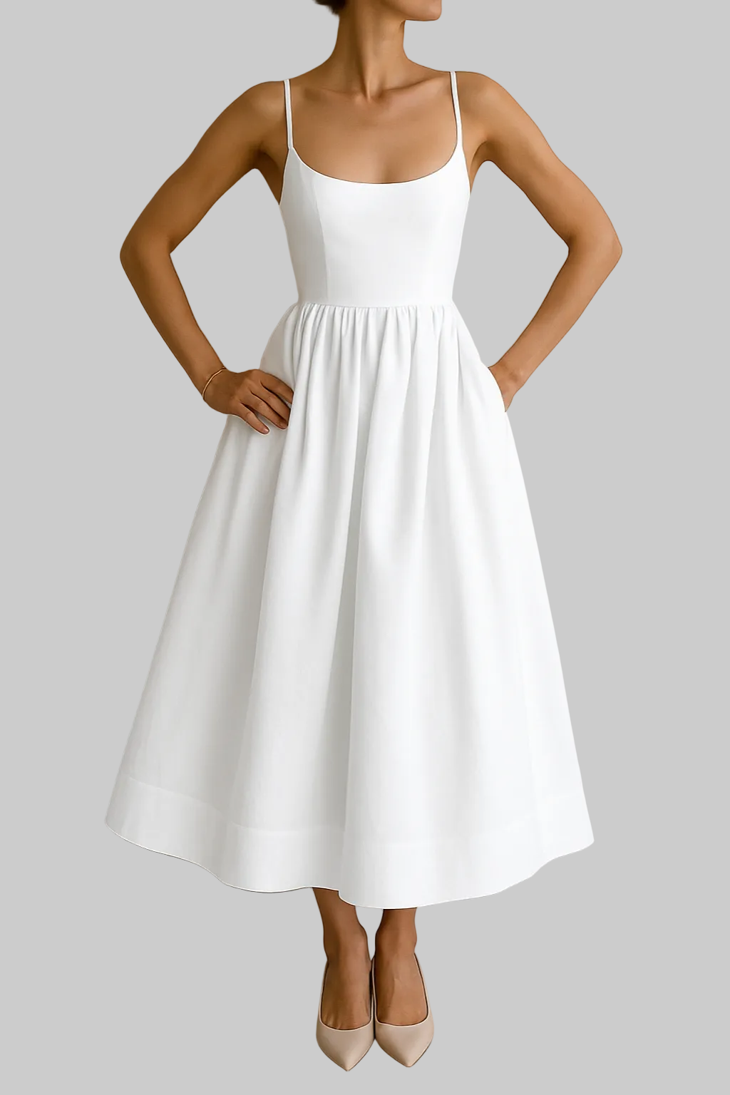 • Rund hals og fine spaghettistropper for et subtilt og feminint uttrykk